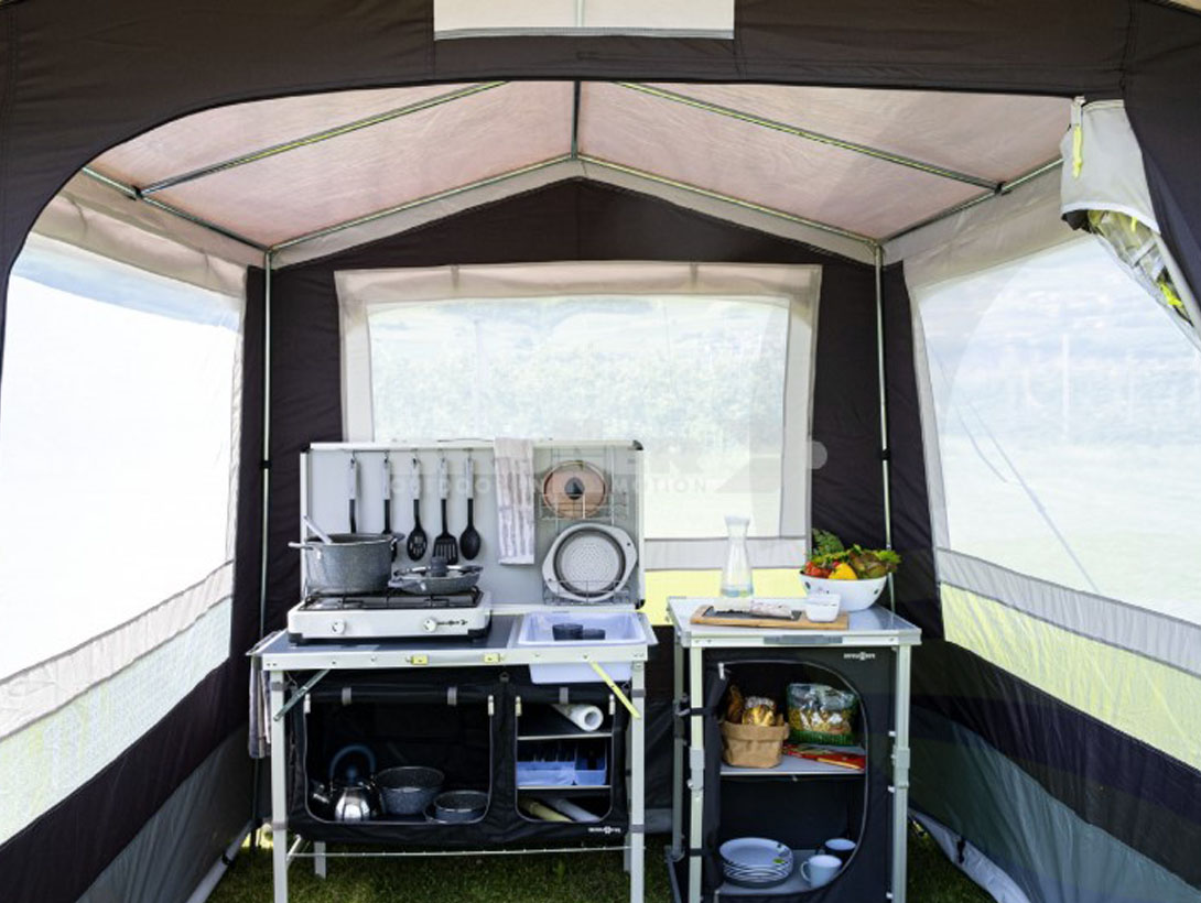 The Brunner Gusto NG Cooking Tent with gabled roof is the ultimate solution for outdoor chefs and camping enthusiasts who want a comfortable, practical cooking shelter.