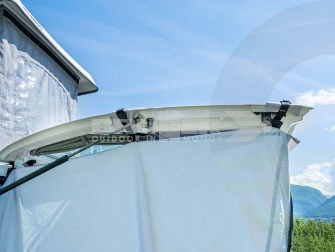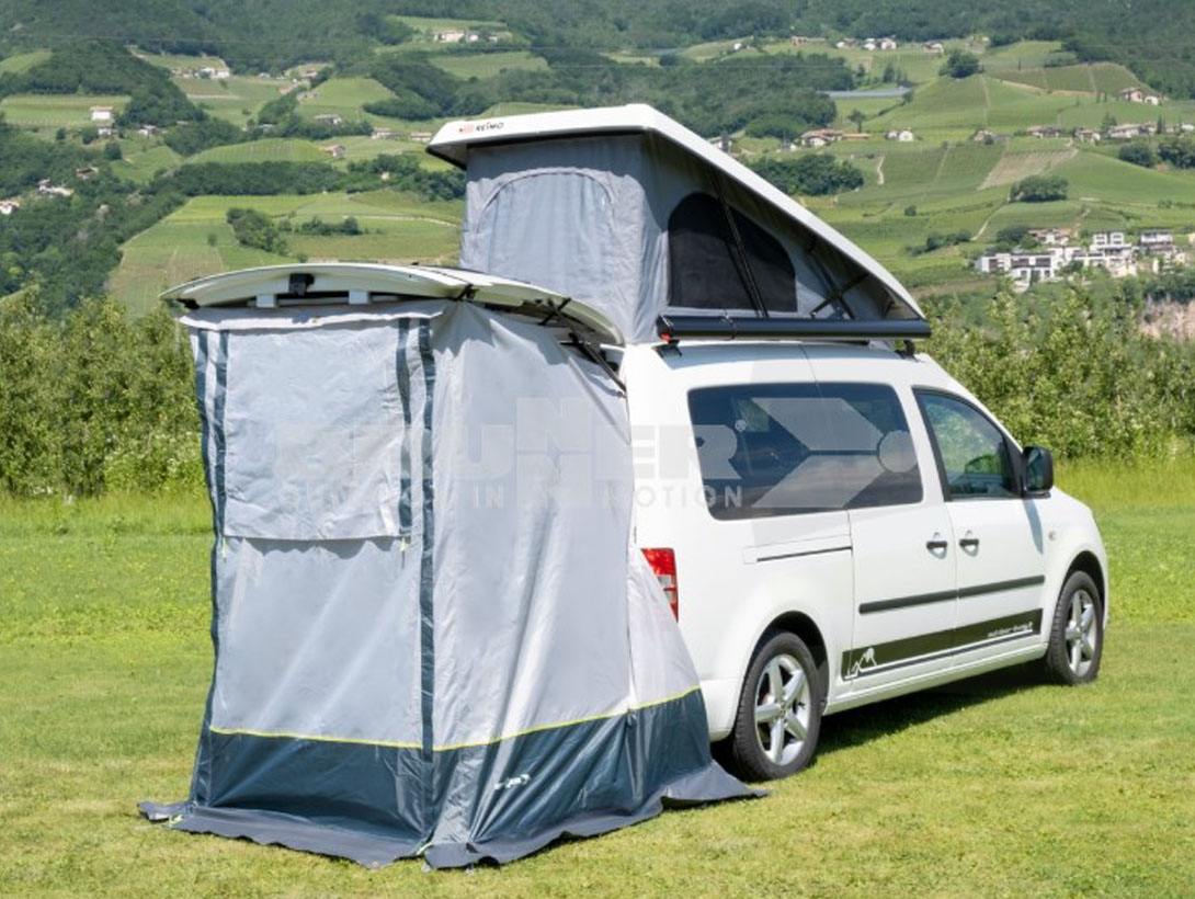 Specially developed as a frameless rear tent, it attaches directly to the tailgate of the VW Caddy, transforming the back of your vehicle into a practical and comfortable extension of your interior.