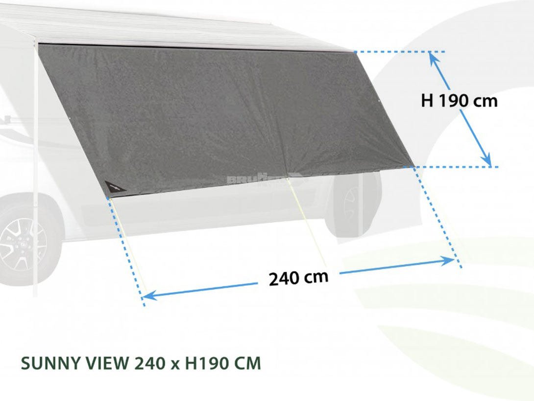 Designed for versatility, the Sunny View easily attaches to the piping rail of caravans, motorhomes, box vans, or buses, making it compatible with most common awning models. The package includes everything you need for a secure setup: sturdy poles, pegs, and guy ropes, allowing you to create a comfortable, shaded space in minutes.