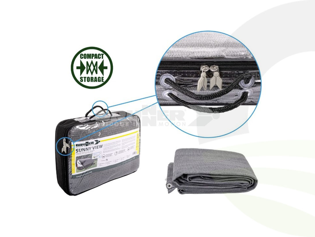 Made from 100% high-quality polyethylene, the Brunner Sunny View is built to withstand outdoor conditions while remaining simple to store and transport. Its double connection system enhances attachment security, giving you peace of mind during your travels.