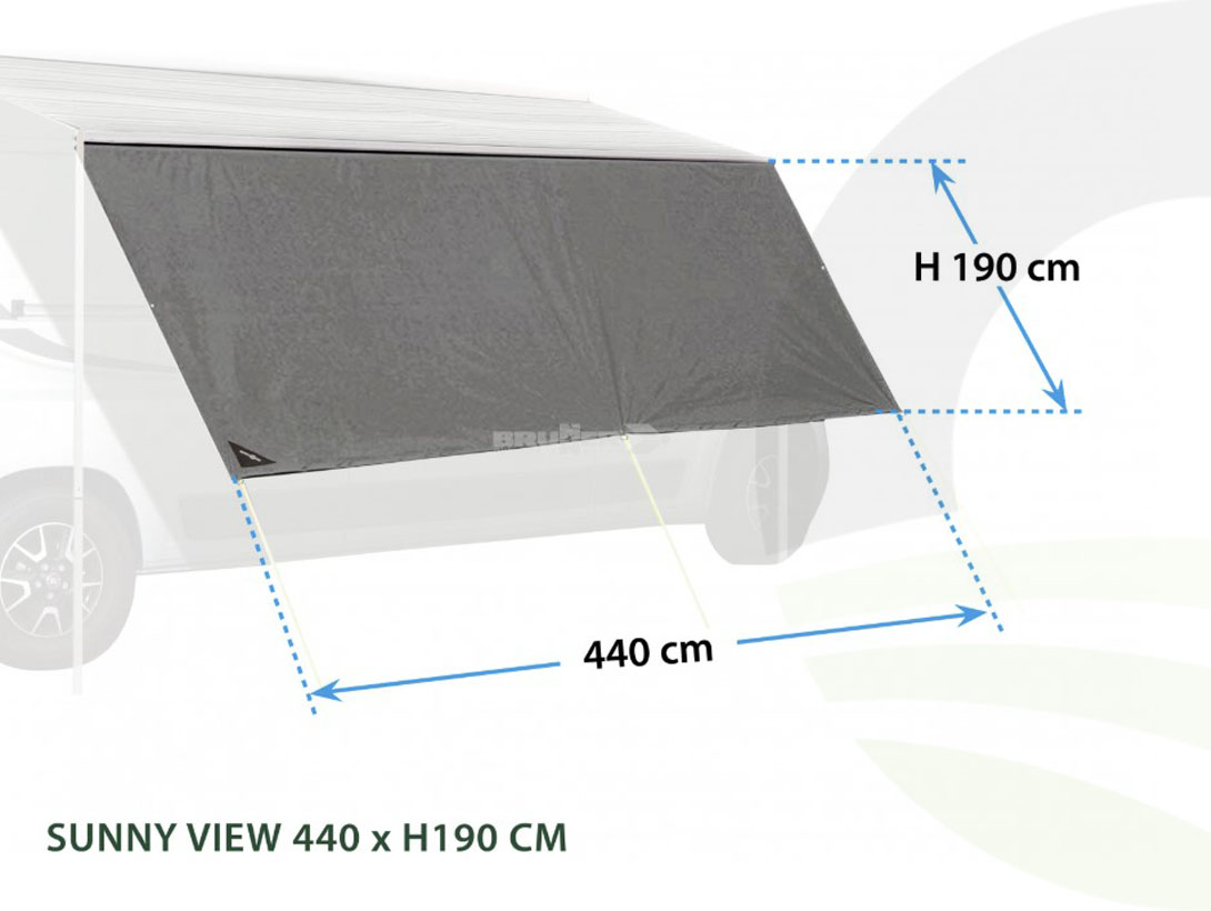 Designed for versatility, the Sunny View easily attaches to the piping rail of caravans, motorhomes, box vans, or buses, making it compatible with most common awning models. The package includes everything you need for a secure setup: sturdy poles, pegs, and guy ropes, allowing you to create a comfortable, shaded space in minutes.
