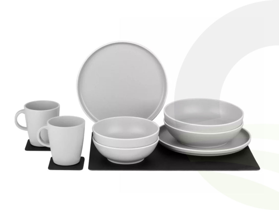 Designed for motorhomes, campervans and boats, this premium tableware set combines elegant design with clever magnetic technology to keep everything securely in place while travelling.