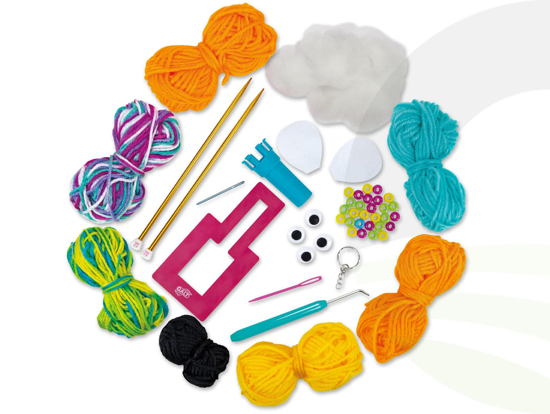 - Contents: 8 balls of wool, knitting needles, French knitter, pompom tool, beads, bodkin, guide