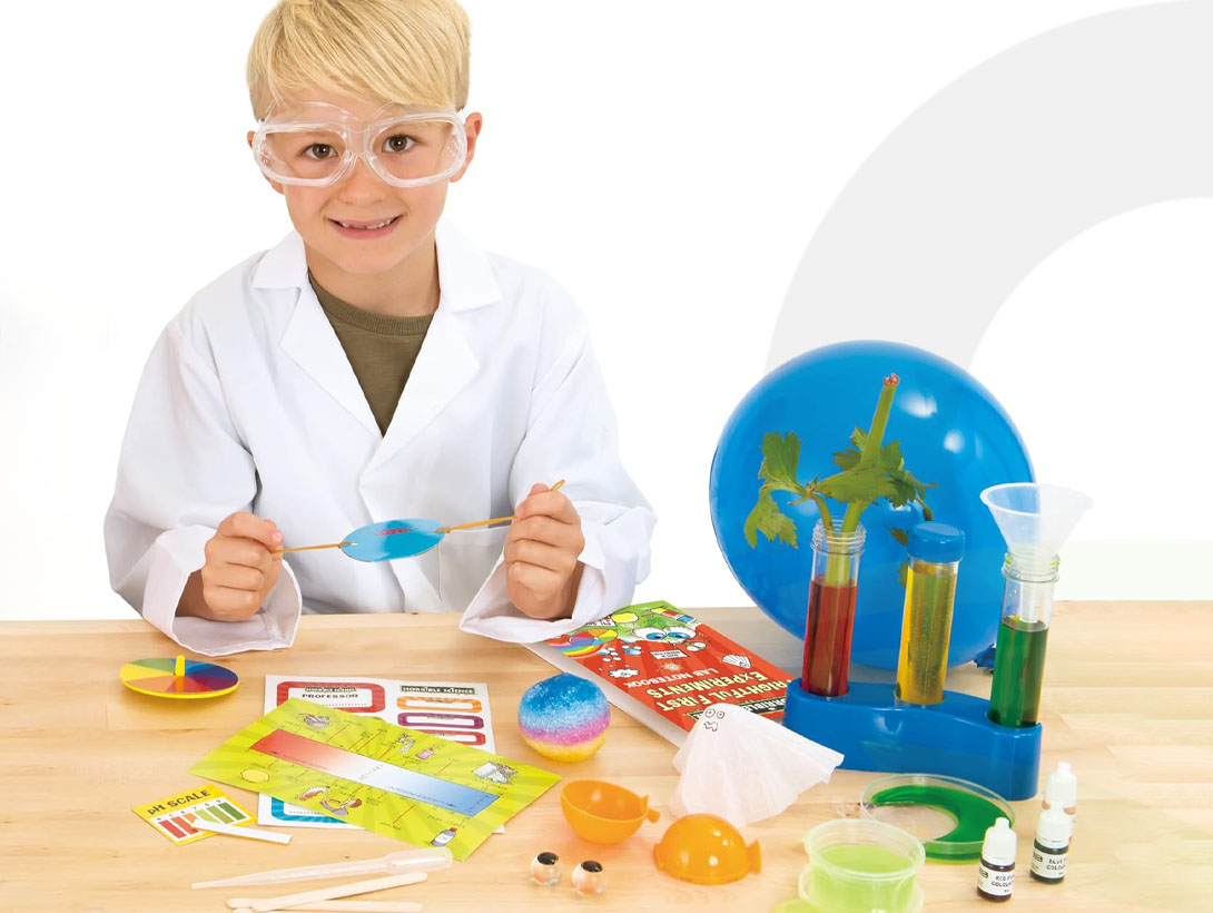 - Contents: 3 test tubes, test tube rack, goggles, ball mould and crystals, magnifying glass, spinner, slime pot, squishy eyeballs, 3 food colourings, Petri-dish, funnel, pipette, pH scale and paper, printed card pieces, stickers, tissue paper, 2 balloons, 3 mixing sticks, 2 rubber bands, paper clip and 40 page lab notebook