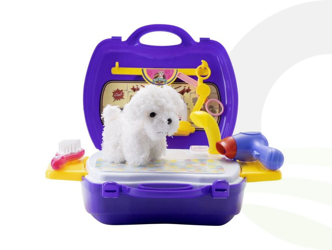 This 15-piece set includes a hair dryer, brush, shampoo, removable shower, and an adorable white fluffy plush puppy, giving children everything they need to create their own imaginative pet parlour.