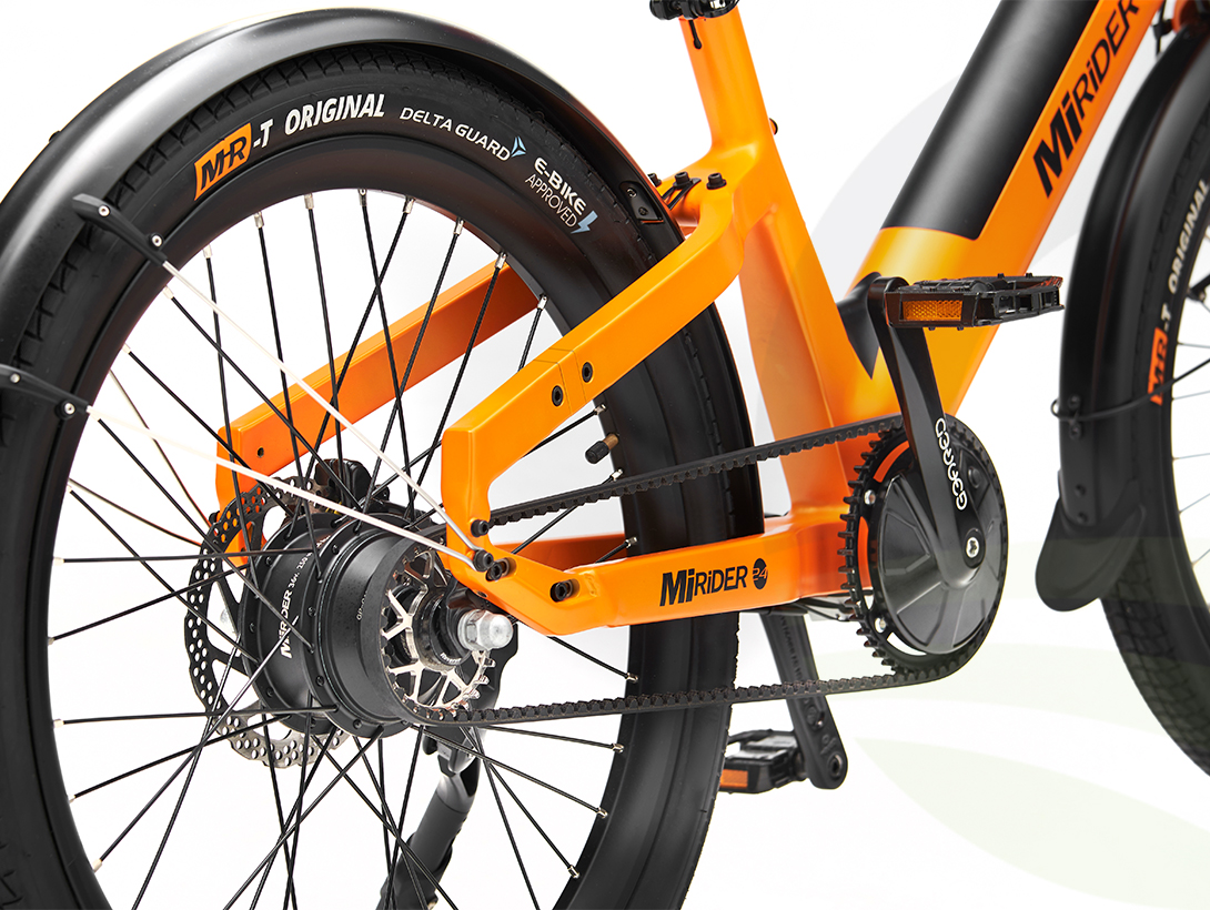 With its patented three-speed gearbox and Gates Carbon Drive belt system, this bike redefines e-bike capability, offering an efficient, low-maintenance alternative to traditional chain-driven models. The MiRiDER 24 combines the fun, lightweight agility that MiRiDER is known for, while pushing the boundaries of what a folding e-bike can do.