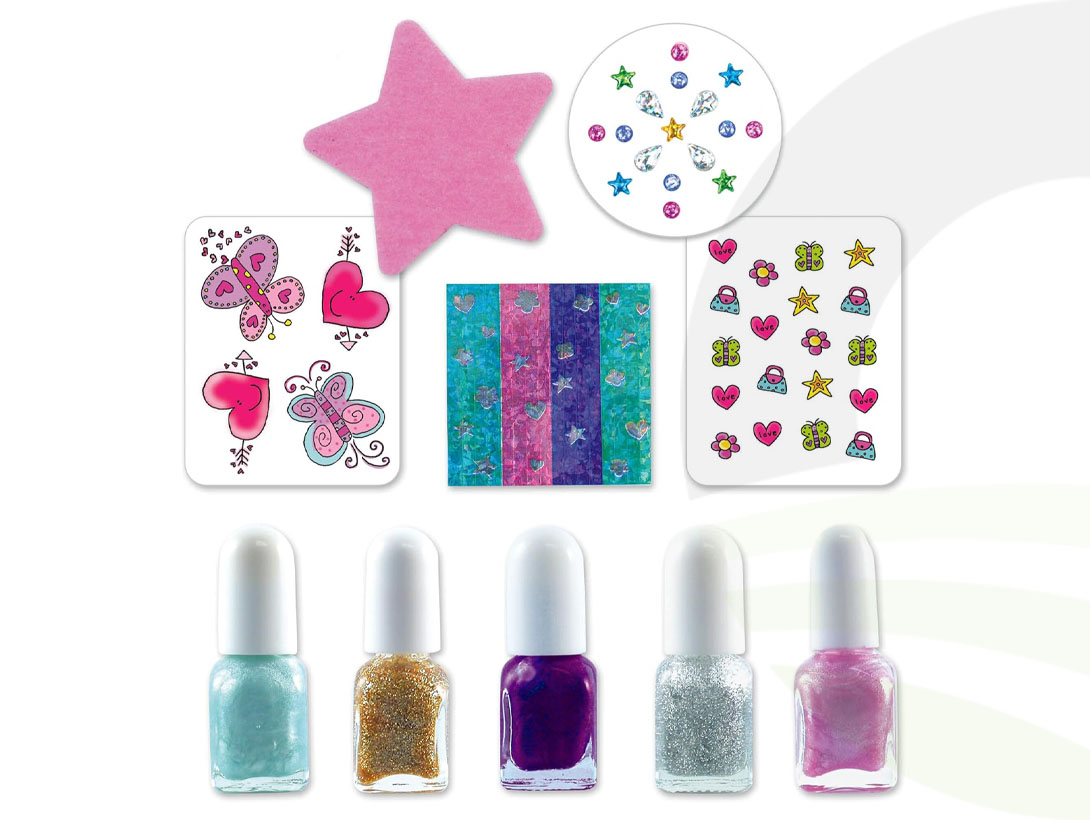 - Contents: 5 coloured nail varnishes, 2 glitter nail varnishes, nail gems, holographic strips, tattoos and star shaped emery board
