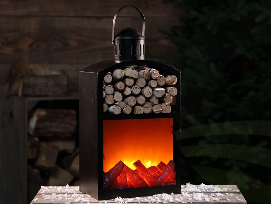 Crafted from durable metal, wood, and accented with sleek plastic and wire detailing, this lantern adds a warm, inviting glow to any indoor space. Its realistic log storage design complements the captivating burning effect, brought to life by three warm white LEDs, creating a cozy and ambient atmosphere that instantly enhances your interiors.