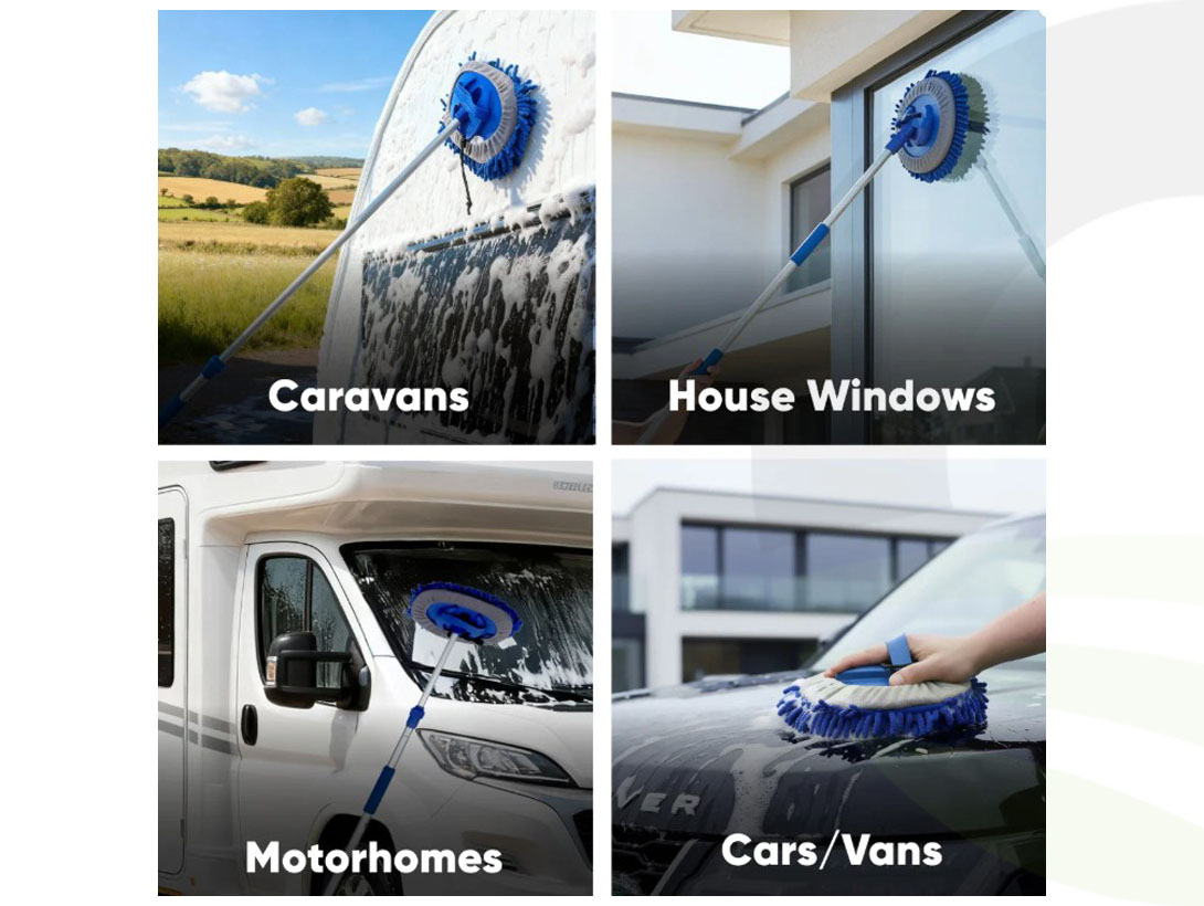 This flow-through telescopic brush is a versatile and effective cleaning tool, perfect for use on caravans, motorhomes, cars, and around the home.