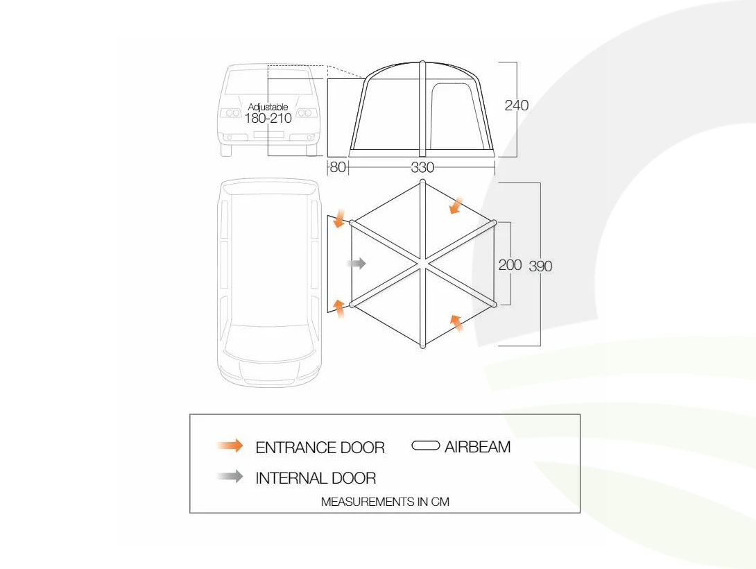 This inflatable AirBeam awning ensures effortless setup with its single inflation system and ergonomic pump, complete with a pressure dial. Pre-angled beams provide greater internal space and added stability against winds. The connecting tunnel can be conveniently rolled away when driving off for the day, and its dual side-entry doors offer easy access to your vehicle. Multiple attachment options ensure compatibility with various vehicles, including kador strips, roof bar tabs, and pole-and-clamp systems.
