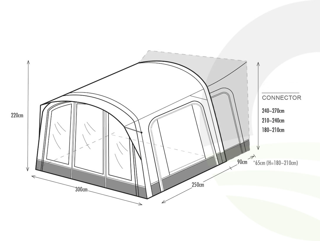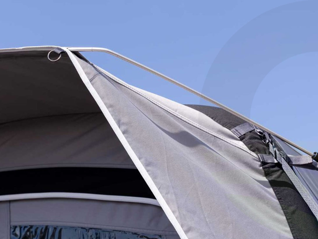 Thanks to its zip-on functional connector (available in three sizes), it provides a versatile and secure fit whether you use a kador strip, tunnel pole, or guy ropes. The connector also features two doors for quick access to your vehicle.