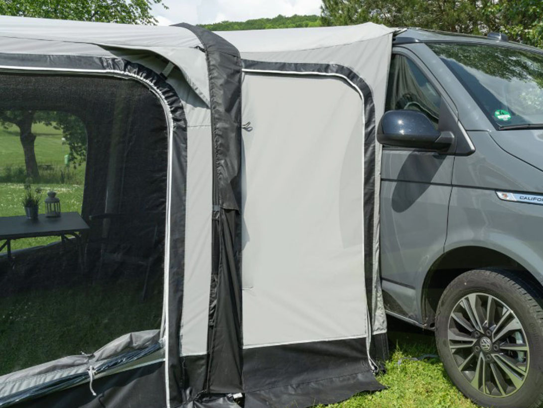Thanks to its zip-on functional connector (available in three sizes), it provides a versatile and secure fit whether you use a kador strip, tunnel pole, or guy ropes. The connector also features two doors for quick access to your vehicle.